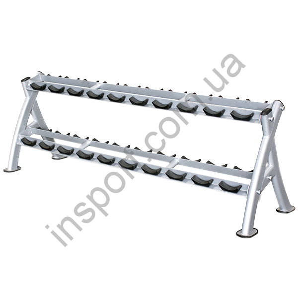 Посадочные места на стойке расположены под углом 20° для удобного извлечения и возвращения гантелей на место. Стойка рассчитана на 10 пар профессиональных гантелей.