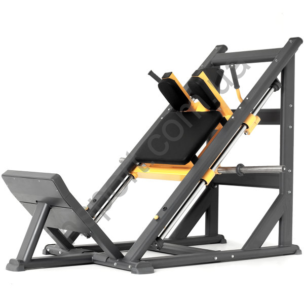 Гак-машина под углом 45° Master-Sport Hacklift 45° Linear NS 15L из серии профессиональных тренажеров Natural Strength на свободных весах используется для тренировки мышц ног, в частности бедер и ягодиц. Возможность применения большой нагрузки (до 500 кг) и безопасность выполнения упражнения позволяют Вам повысить свои силовые способности, не беспокоясь о серьезных травмах. Биомеханическое движение устройства способствует превосходному воздействию на тренируемые мышцы. Конструкция тренажера выполнена из плоского овального стального профиля. При производстве ее металлических частей используется лазерная резка исключительной точности, что несомненно сказывается на качестве выполнения упражнения. Элементы обивки соответствуют анатомическим формам тела. Части тренажера, которые имеют прямой контакт с ногами, изготовлены из хромоникелевого стального листа со специальными нескользящими резиновыми вставками, обеспечивающими идеальное сцепление и безопасность во время тренировки.