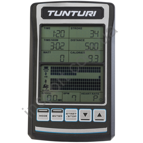 Показания дисплея Время тренировки, пройденная дистанция, скорость, время прохождения 500 м, потраченные калории, общее количество гребков, количество гребков в минуту, пульс