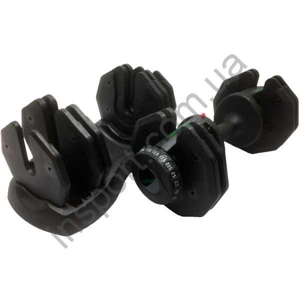 Гантели со стойкой Tunturi 2*25 kg Selector Dumbbells with Stand 14TUSCL383-384 регулируются в диапазоне от 2,5 до 25 кг, используя уникальную систему набора. Очень компактный комплект, который заменяет гантельный ряд и занимает небольшое рабочее пространство. Размер гантели - 40*20*23 см, размер стойки - 70,5*52*62,2 см.