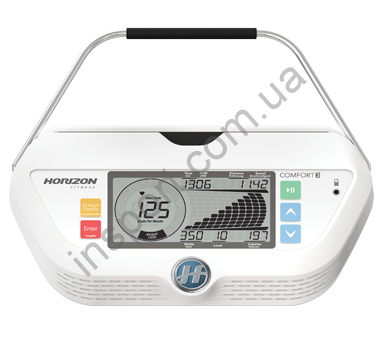 HORIZON™ Comfort 3 NEW - обновленная версия популярного электромагнитного велоэргометра Comfort 3 от Horizon. Также как и предшествующая модель, он сконструирован из особо прочной рамы и имеет сбалансированный маховик 7 кг., трехкомпонентный педальный узел и запатентованную приводная систему ECB™, которая обеспечивает самый плавный ход и достаточную нагрузку. Изменения коснулись конструкции руля - теперь он обладает многопозиционными ручками, в которые встроены сенсорные датчики пульса. Помимо этого в консоль встроен телеметрический Polar приемник. В этом случае, при сравнении с обычными датчиками пульса, использование пульсозависимых программ становится действительно эффективным - точность измерения пульса близка к медицинской, не зависит от индивидуальных особенностей организма (т.н. проблема "сухих рук" или недостаточной электропроводности) и, наконец, это значительно удобнее. В число программ входят несколько предустановленных разнонаправленных тренировочных профилей, а также ручной режим, 1 пульсозависимая, 1 пользовательская и 1 Ватт-фиксированная программы. Большая многофункциональная черно-белая LCD консоль диагональю 5.5 дюймов (14 см.) выводит на экран все основные параметры, включая профиль выполняемой тренировки. Интересной особенностью компьютера является индикатор активных зон, показывающий насколько пользователь справляется с целями тренировки. Помимо этого в тренажере предусмотрены элегантная подставка под планшет или книгу, держатель для полотенца и противоскользящий держатель для бутылки.