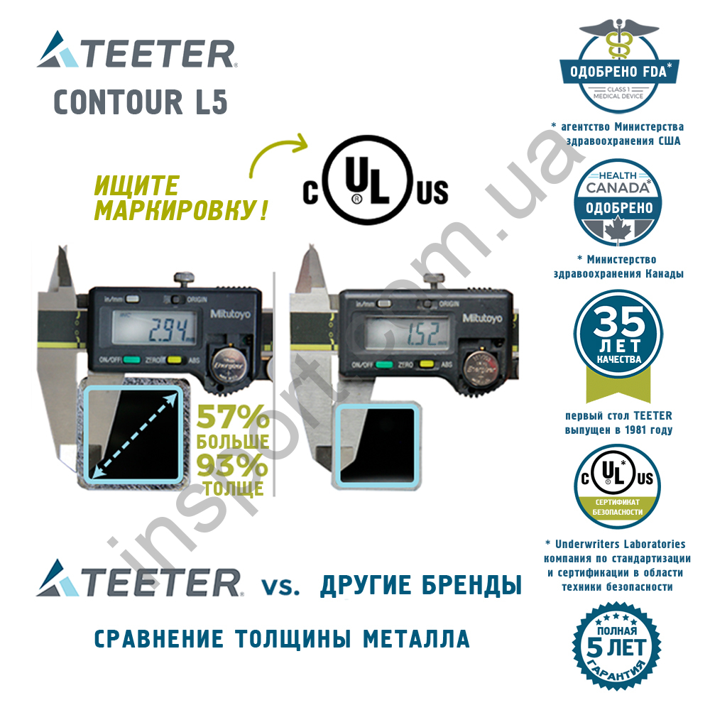 - соотношение основания к высоте стола у Teeter в среднем на 20% больше, чем у других инверсионных столов на рынке. Это исключает возможность опрокидывания стола при выполнении инверсии и динамических упражнений в висе;