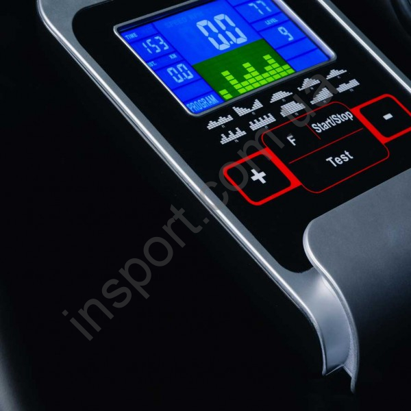 Цветной LCD дисплей с подсветкой и индикацией следующих параметров: время, скорость, дистанция, общая дистанция, прибл. расход калорий, частота вращения педалей, нагрузка в Ваттах и пульс