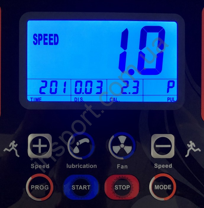 жидкокристаллический 5-и дюймовый дисплей с голубой подсветкой, отражающий следующие параметры: время тренировки, пройденная дистанция, скорость, угол наклона, расход калорий, пульс
