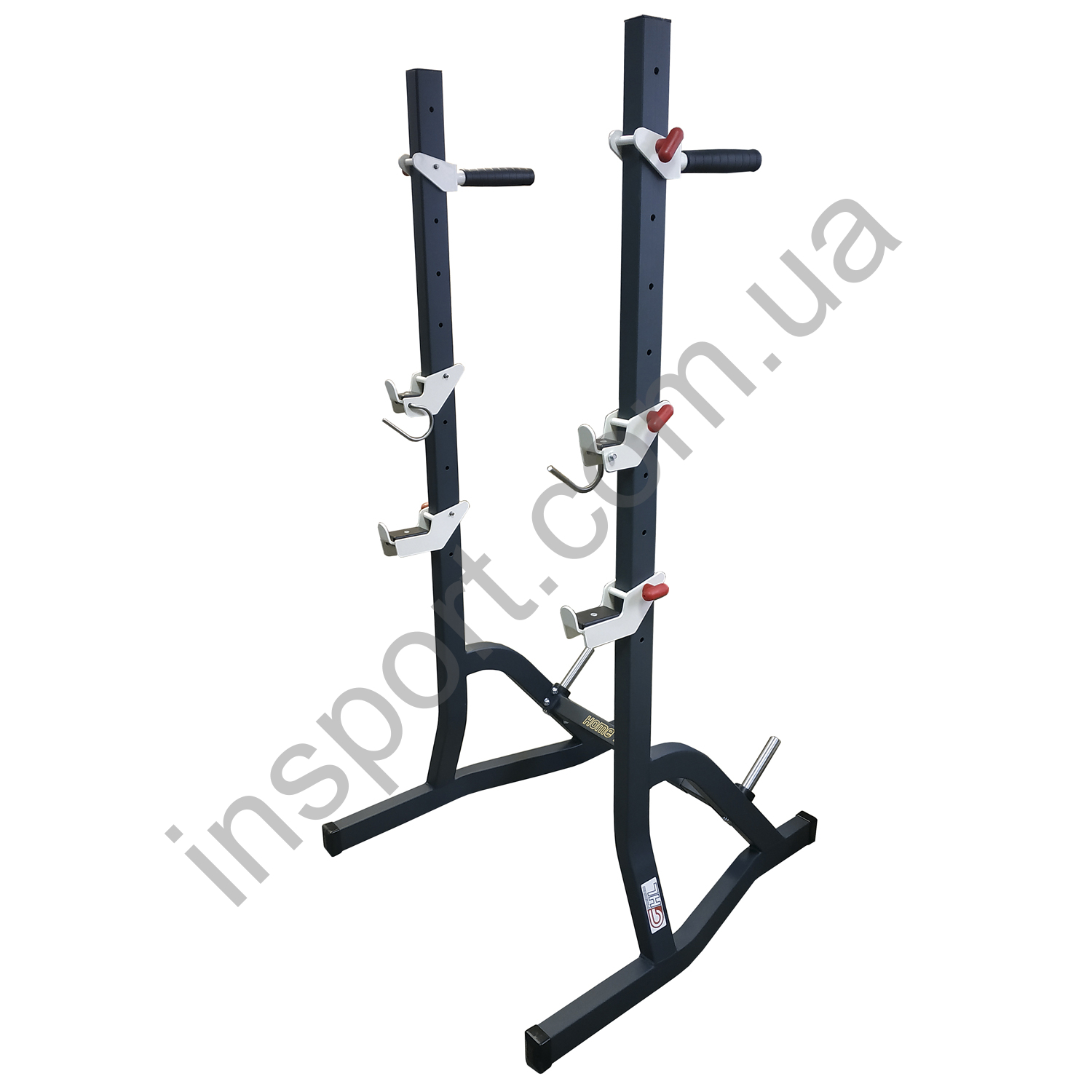 Высота стоек подобрана таким образом, чтобы была возможность удобно снимать штангу для упражнений на приседания или выпадов. Для удовлетворения требований пользователей всех возрастов и комплекции конструкция стоек предусматривает возможность регулировать ширину в пределах 550 - 840 мм. Важным преимуществом в стоек является наличие вспомогательных страховочных крюков, что способствует безопасности тренировок в домашних условиях. Для хранения дисков предусмотрены специальные штыри.
