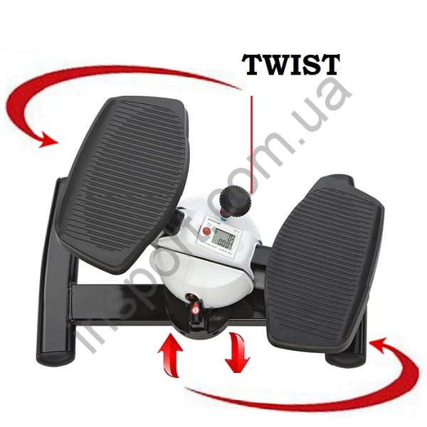 Балансировочный министеппер сочетает в себе поворотные и вращательные движения, поэтому и называется «твист». Таким образом упражнения на степпере осуществляются вверх-вниз и в стороны, что усиливает работу мышц ног, ягодиц и спины, а также развивает выносливость, укрепляет суставы и способствует улучшению функционирования сердечно-сосудистой и дыхательной системы. Более интенсивная нагрузка приходится на внутреннюю поверхность бедра и талию. Благодаря особенностям своей конструкции, позволяет тренировать косые и нижние мышцы брюшного пресса.