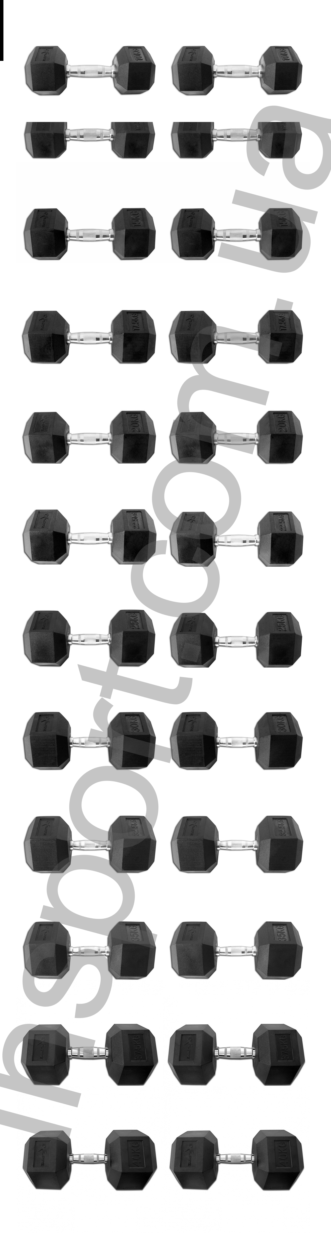 Вес, кг: 2х10кг, 2х12,5кг, 2х15кг, 2х17,5кг, 2х20кг, 2х22,5кг, 2х25кг, 2х27.5кг, 2х30кг, 2х32.5кг, 2х35кг, 2х37.5кг, 2х40кг