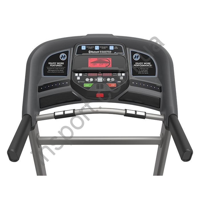 Отображает: Калории, расстояние, частота пульса, наклон, скорость, время, подключения смартфона по блютуз.