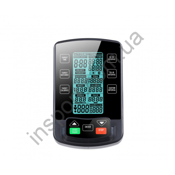 рідкокристалічний дисплей відображає різні режими тренування, включаючи 20/10, 10/20, індивідуальний інтервал, час тренування, подолана дистанція, швидкість, витрачені калорії, Ватти та рівень навантаження