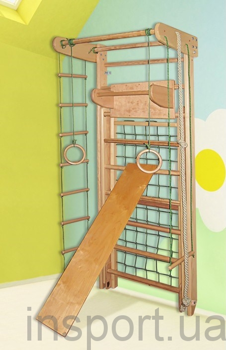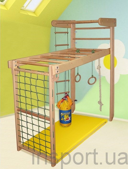 Спортивный уголок-трансформер используется в двух положениях: в сложенном виде он представляет собой стандартную шведскую стенку, а раскладывающаяся нижняя часть превращает его в комплекс с рукоходом и гладиаторской сеткой для лазания. Процесс сборки и разборки предельно простой и занимает не более 1 минуты. Этот спортивный уголок является оптимальным решением, как наиболее функциональный и компактный.
