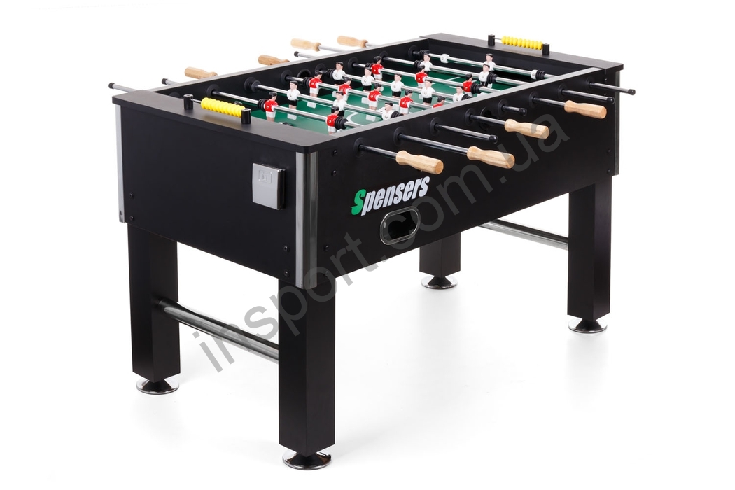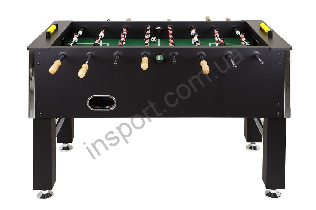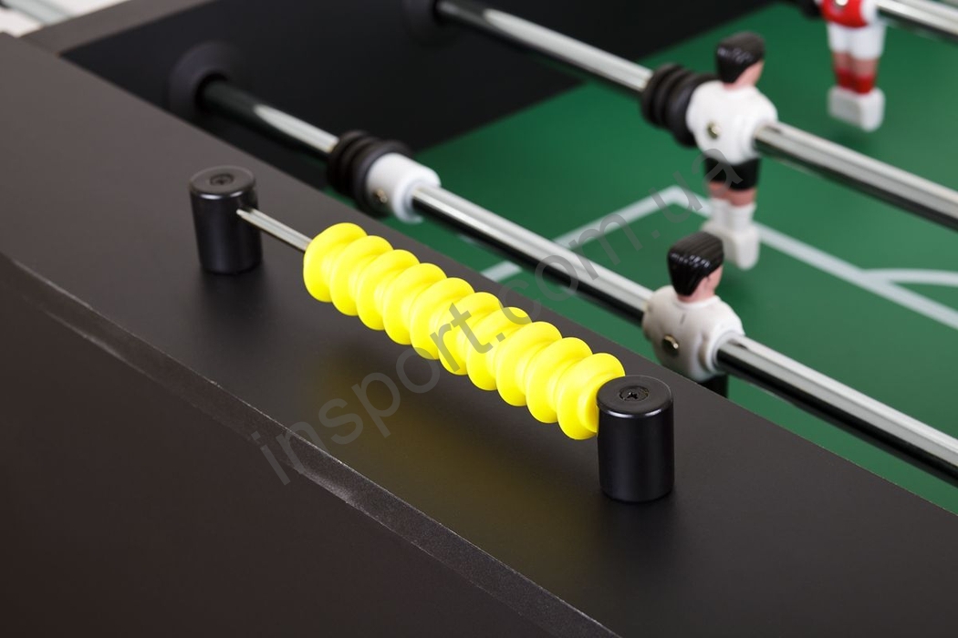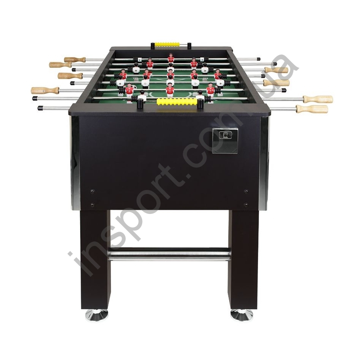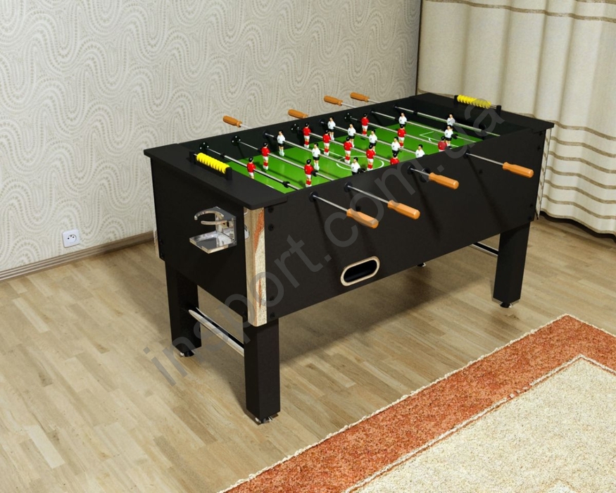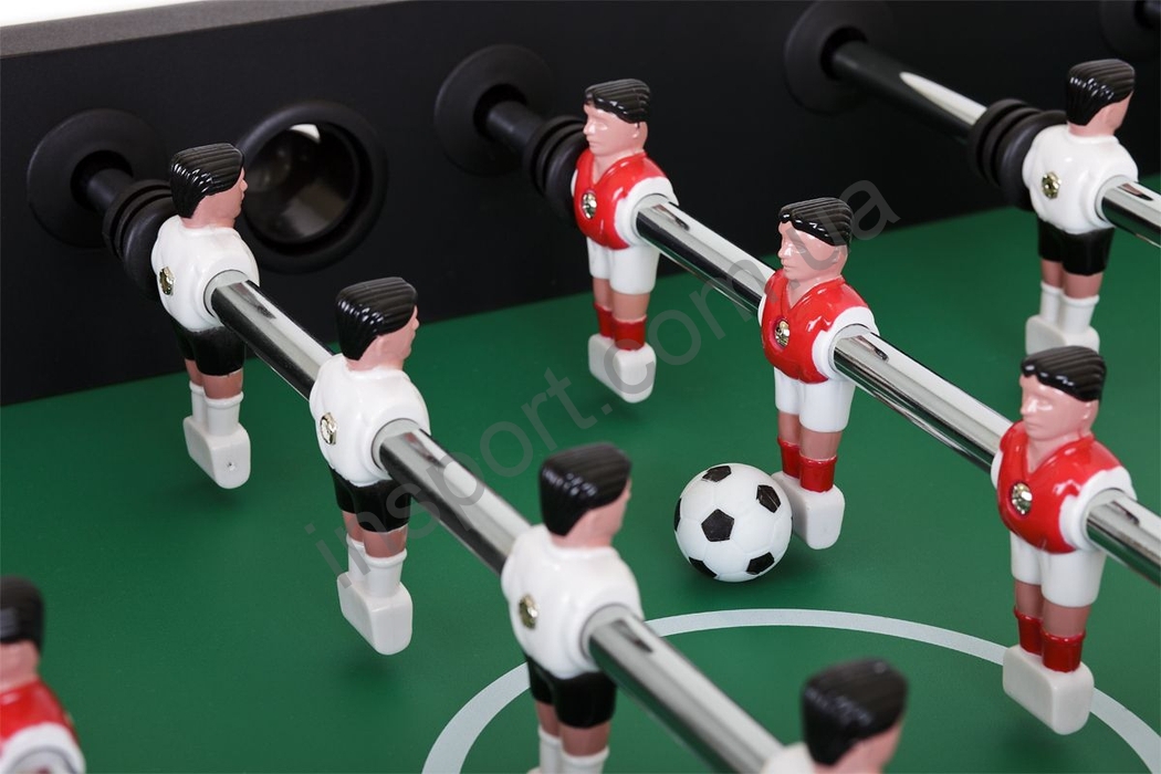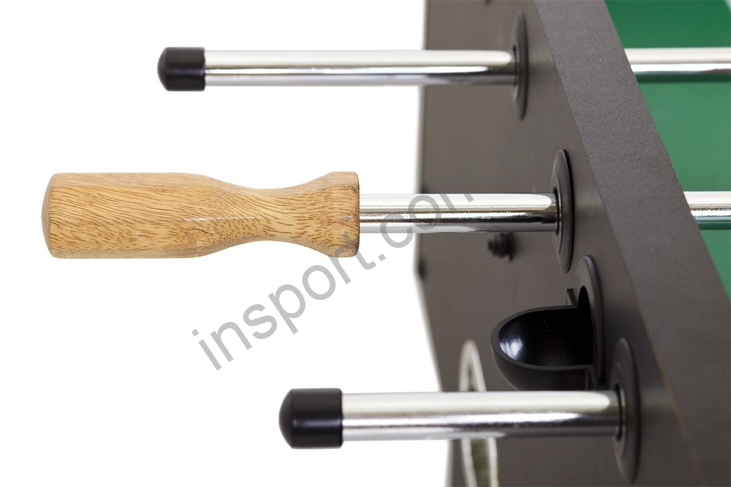В конструкции футбольного стола все элементы выполнены из прочных материалов. Ручки для управления футболистами деревянные, само покрытие стола изготовлено из плиты МДФ, покрытой ламинатом. Такое поле устойчиво к влаге, и защищено от стирания и механических повреждений.
