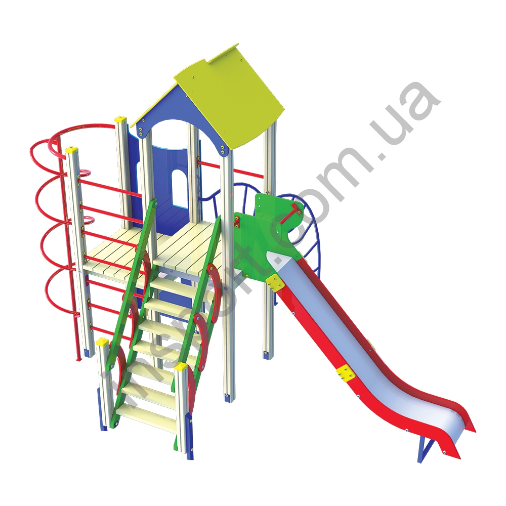 - с одной стороны к платформе подходит лестница с перилами, с другой лестница из гнутой трубы, с третьей лестница дуговая а с четвертой горка большая