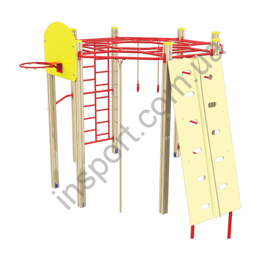 - гимнастический комплекс представляет собой единую конструкцию, которая состоит из рукохода, лианы-лестницы, прямой лестницы, брусьев, доски скалолаза, кольца, каната и баскетбольного шита, которые закреплены на деревянных брусах