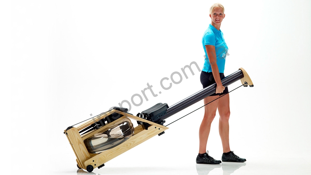 Расположенный снизу резервуар с водой создает смещенный центр тяжести, что позволяет с легкостью поднять конец тренажера, поставить его вертикально или переместить при помощи колесиков. При хранении в вертикальном положении WaterRower занимает площадь обычного стул
