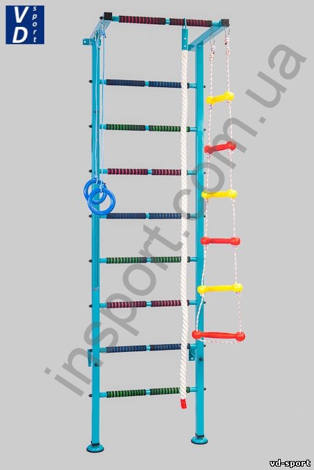 - ширина шведской стенки 0,63 м - высота шведской стенки 2,30 м - вылет перекладины — 0,44 м - требуемая высота помещения, в котором устанавливается спортивный уголок — 2,30 металлические перекладины шведской стенки покрыты поролоном - канат 1,80 м |