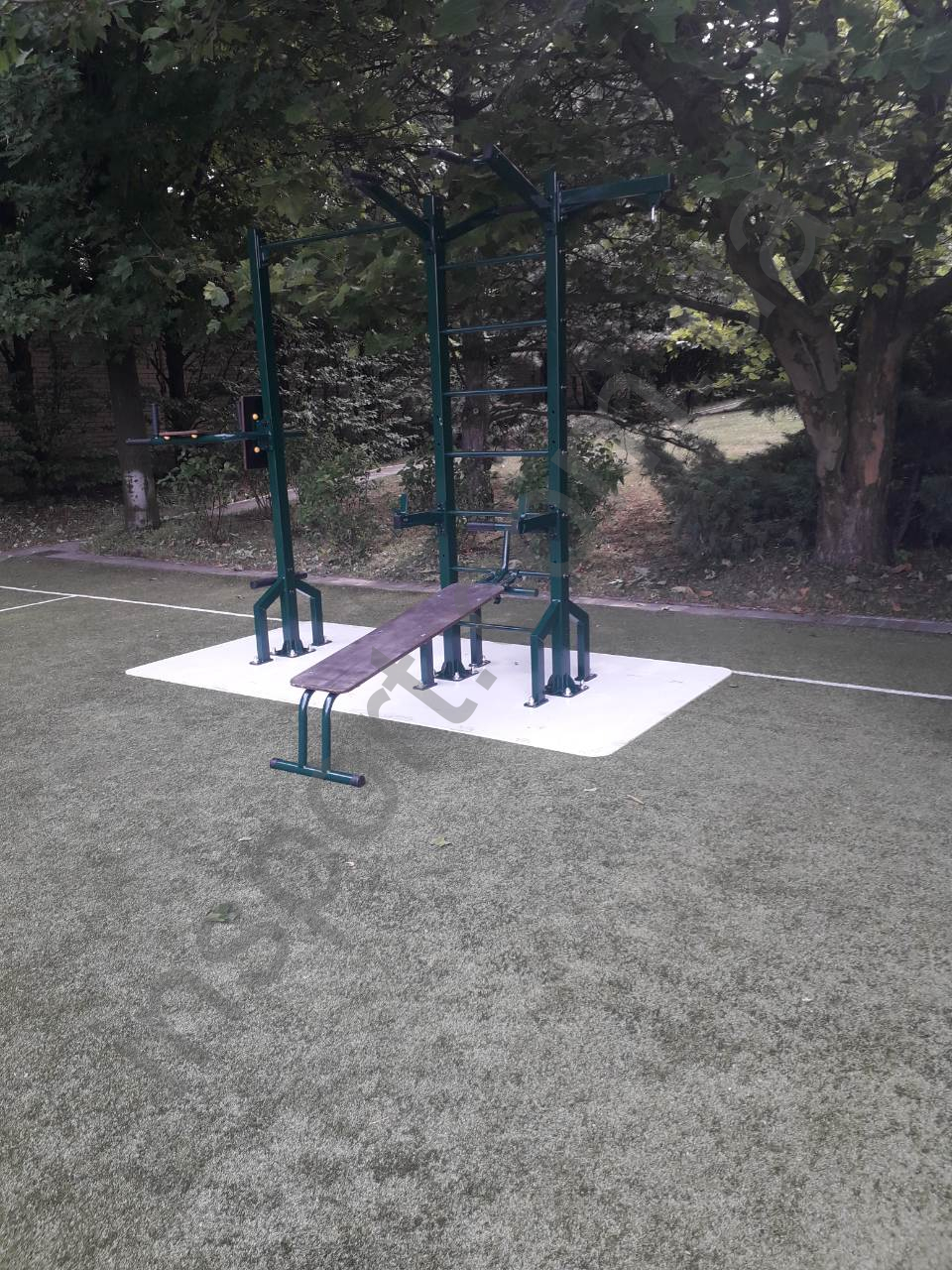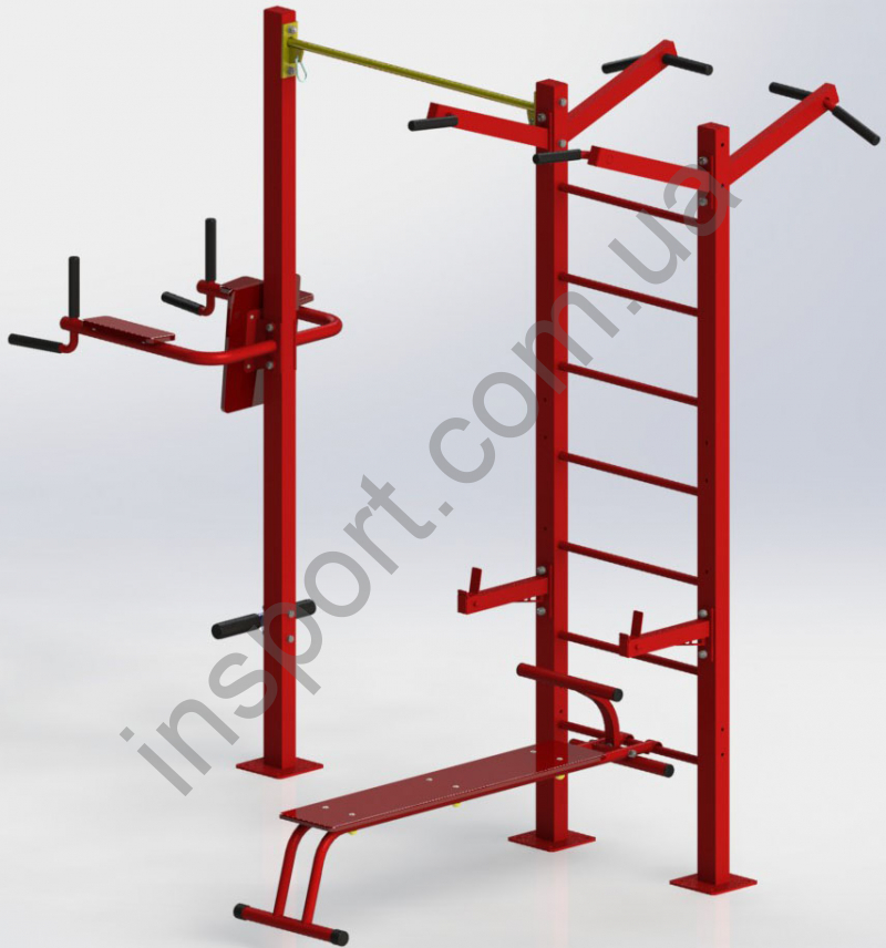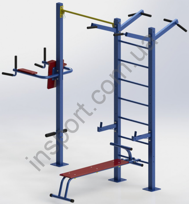 В комплект входит шведская стенка, лавка для пресса или выполнений жима лежа, брусья, турник.