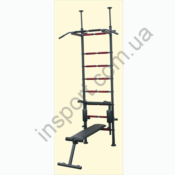 - стойка с жестко закрепленным турником; - навесные брусья с подставкой под штангу для жима; - навесная скамья для пресса, складывающаяся, с валиком для ног; - возможна доукомплектация детским веревочным комплектом; - комплект распорок пол-потолок и 4 кронштейна к стене (без дюбелей/анкеров). |