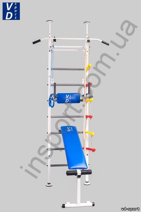 | Комплектация | Шведская стенка с металлическими перекладинами с пластмассовым покрытием, турник с широким хватом, веревочная лестница, канат, кольца, лавка "пресса", брусья. |