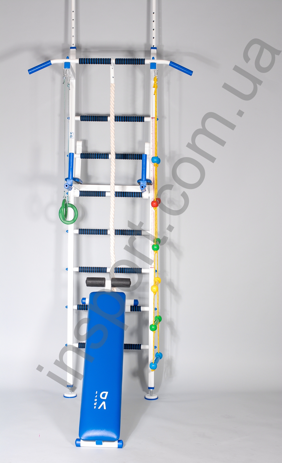- шведская стенка (металлическая с металлическими перекладинами с неопреновыми накладками, цвет: белый, перекладины: белые, накладки черно-синие), - турник (широкий хват, стационарный, усиленный (приварен к стойкам лестницы), ручки пластмассовые - широкий хват, неопреновые накладки - узкий хват), - брусья (брусья с держателями штанги; два положения: брусья-пресс, подставка под штангу; мягкие части - кожзам; цвет: синий) - скамья для пресса (складываемая; два положения: скамья для пресса, лавка для жима; с пенополиуретановыми валиками для ног; мягкие части - кожзам; цвет синий) - детский навесной набор (канат, кольца, веревочная лестница; кольца и веревочная лестница пластмассовые) |