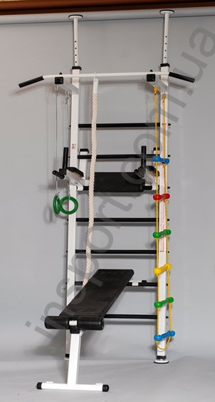 - шведская стенка (металлическая с пластмассовыми перекладинами (внутри металлические), цвет: белый, перекладины: черный) - турник (широкий хват, стационарный, усиленный, ручки пластмассовые) - брусья (с пенополиуретановой спинкой и подлокотниками) - скамья для пресса (складываемая; два положения: скамья для пресса, лавка для жима; с пенополиуретановыми валиками для ног и спинкой) - детский навесной набор (канат, кольца, веревочная лестница; кольца и веревочная лестница пластмассовые или дереаянные - на выбор) |