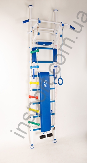 - шведская стенка (металлическая с пластмассовыми перекладинами (внутри металлические); цвет: белый, перекладины: синий) - турник (широкий хват; съемный; устанавливается на любой из перекладин; ручки пластмассовые)