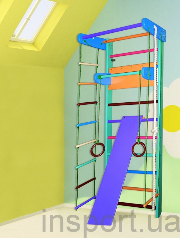 - шведская стенка с верхним турником - веревочный комплект (канат, кольца, трапеция, веревочная лесенка) - навесной детский турник - доска для спины и пресса |