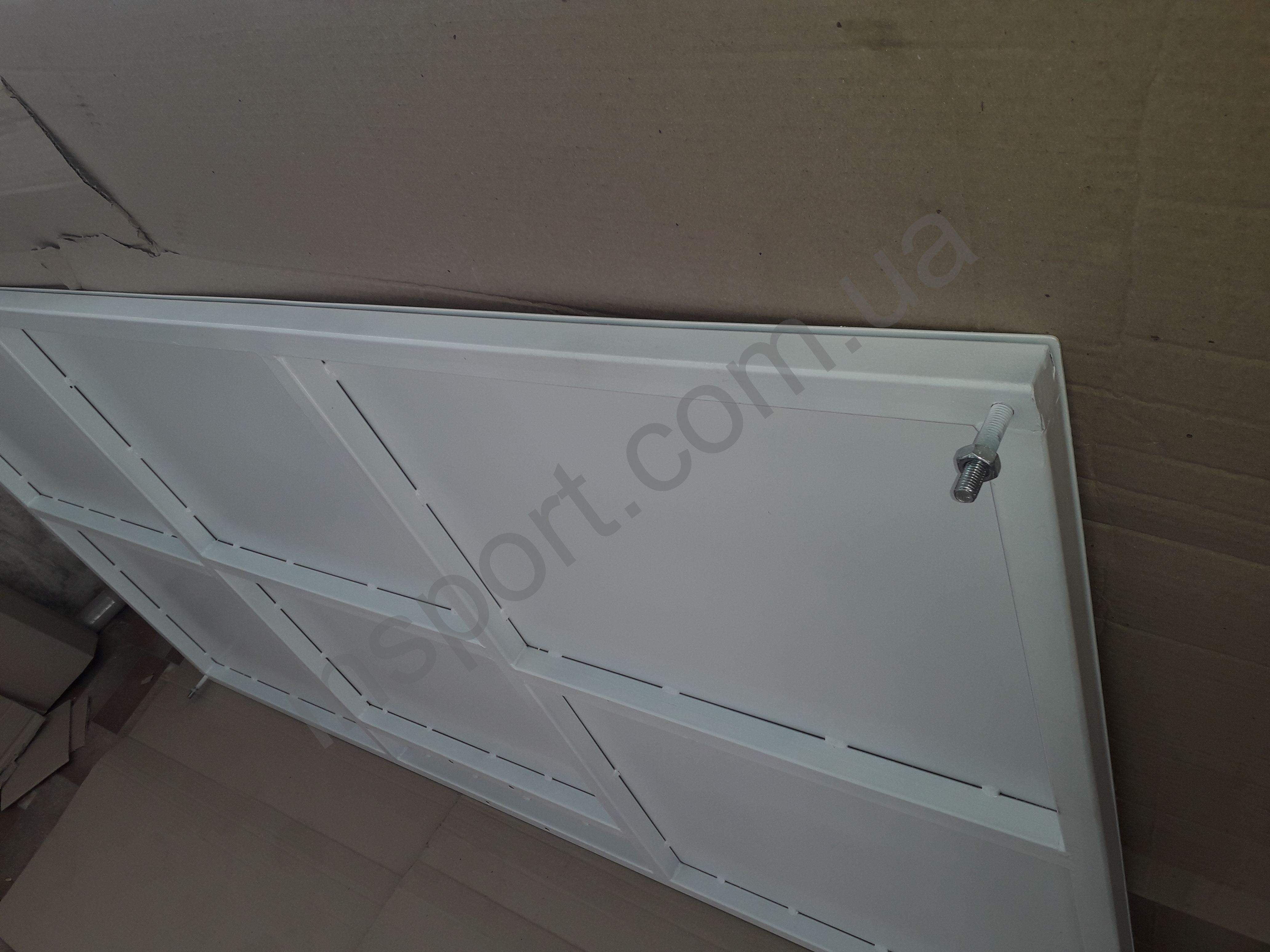 Щит представляет собой панель из листа металла толщиной 2 мм. Рама щита (квадратная труба 30x30мм.) укрепляет общую конструкцию баскетбольного щита и предотвращает его вибрацию. Щит подходит для установки в зале и на уличной площадке. Покраска баскетбольного щита в белый цвет с предварительным нанесением грунта предотвращает его коррозию.