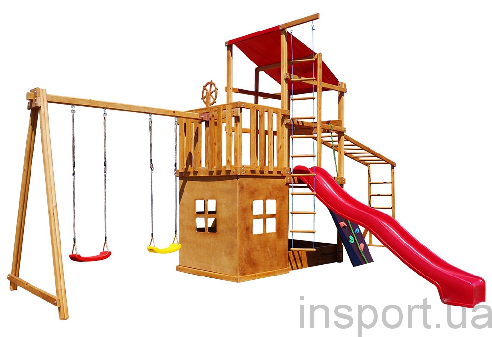 - детский домик с песочницей - площадка с лестницей - детская горка (красная, синяя, зеленая) - качели 2 шт. (красная, зеленая или деревянная) - горка для скалолазания - гимнастические кольца - канат - рукоход - веревочная лестница |