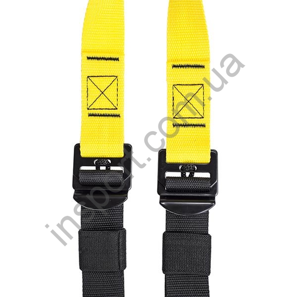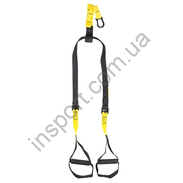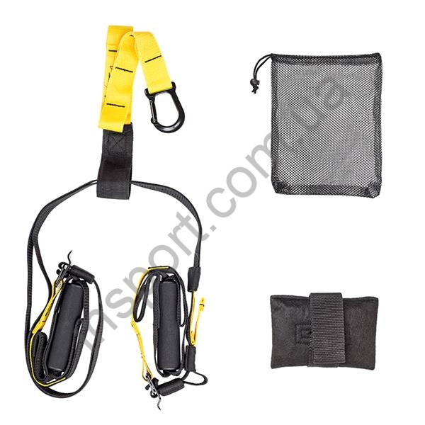 Набор содержит обучающие ленты, завершенные ручками и металлическим карабином, дверной ручкой и сеткой. Ручки покрыты пеной, так что ваши руки не скользят во время тренировки.
