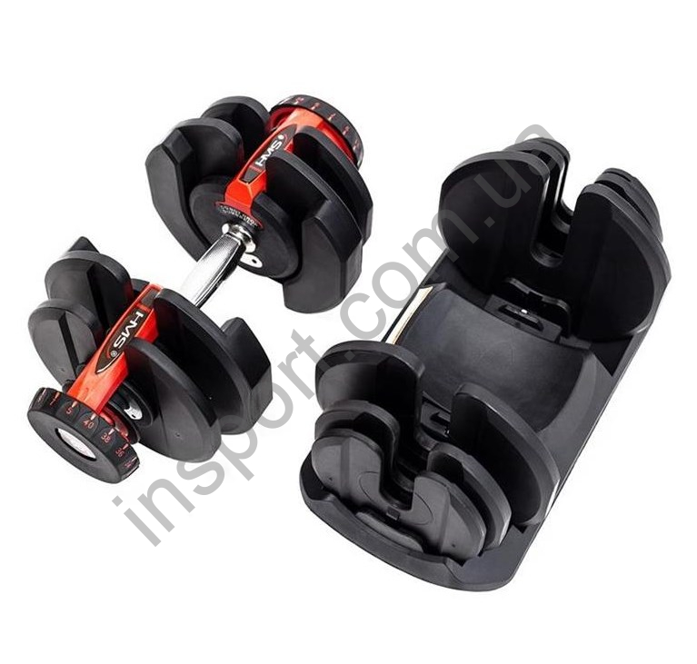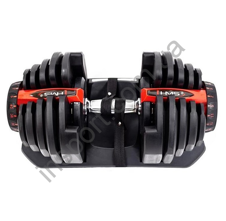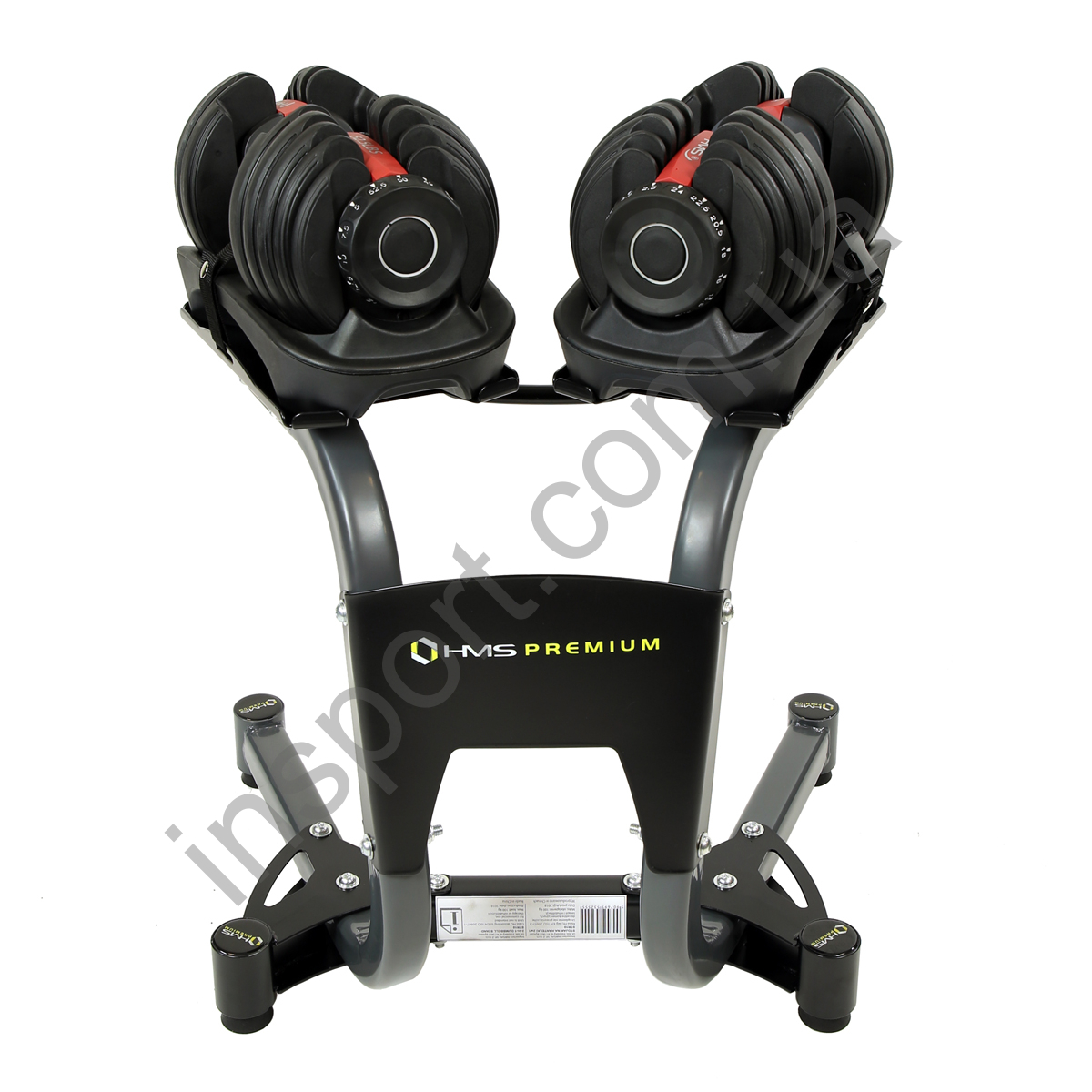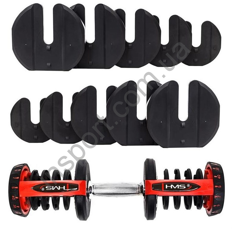 SR80 HMS - регулируемая гантель . В комплект входит горловина, 10 тарелок и подставка. Устройство идеально подходит для людей, занимающихся спортом дома, но оно также хорошо работает в тренажерном зале, заменяя всю стойку традиционными гантелями.