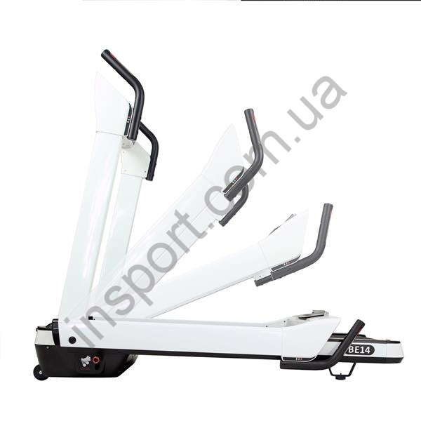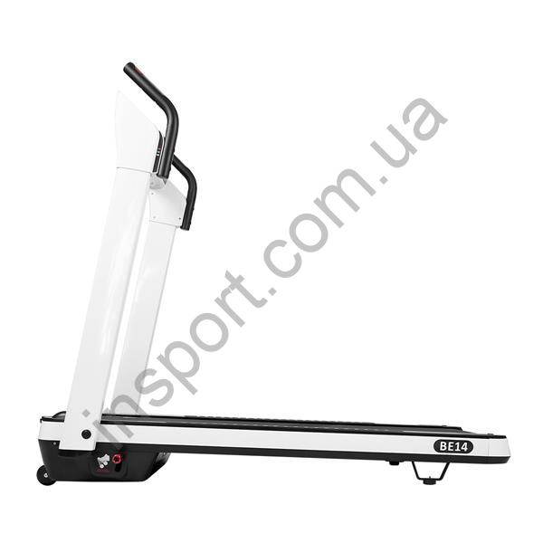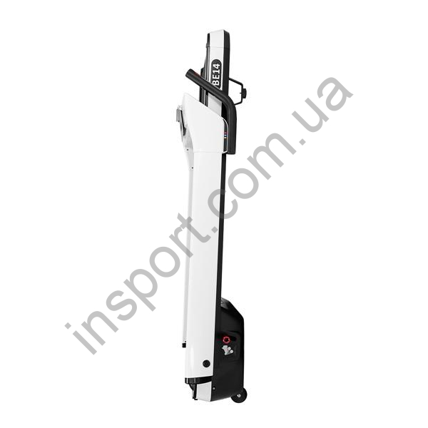 Еще одним преимуществом беговой дорожки является ее размер, благодаря сложенным поручням он не занимает много места. Поручни самопроизвольно складываются после снятия замка и небольшого нажатия. Замок расположен в нижней части беговой дорожки, так что вы можете удобно снять замок, нажав на него ногой. Регулировка BE14 также не будет проблемой, благодаря установленным транспортным колесам без особых усилий, мы можем перемещать беговую дорожку вертикально и горизонтально.