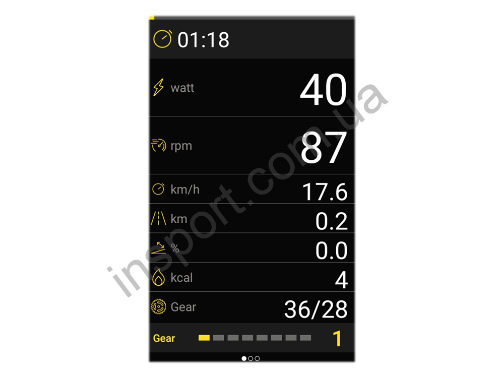 Консоль позволяет получать обратную связь по всем параметрам тренировки: мощность в ваттах (велотренажёр оснащён точным измерителем мощности с погрешностью +/- 1%), число оборотов в минуту, диаметр колеса, скорость, передача, расстояние, наклон, сожжённые калории и другие характеристики текущего занятия.