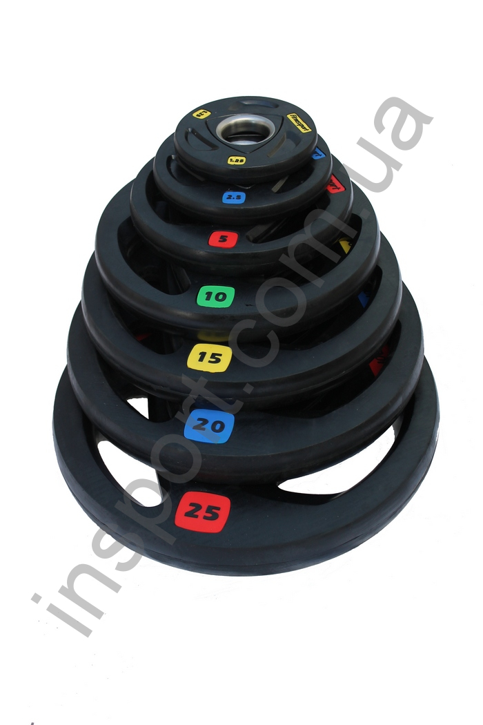 Диски с отверстиями, отверстия начинаются от наминалов 5 кг до 25 кг.