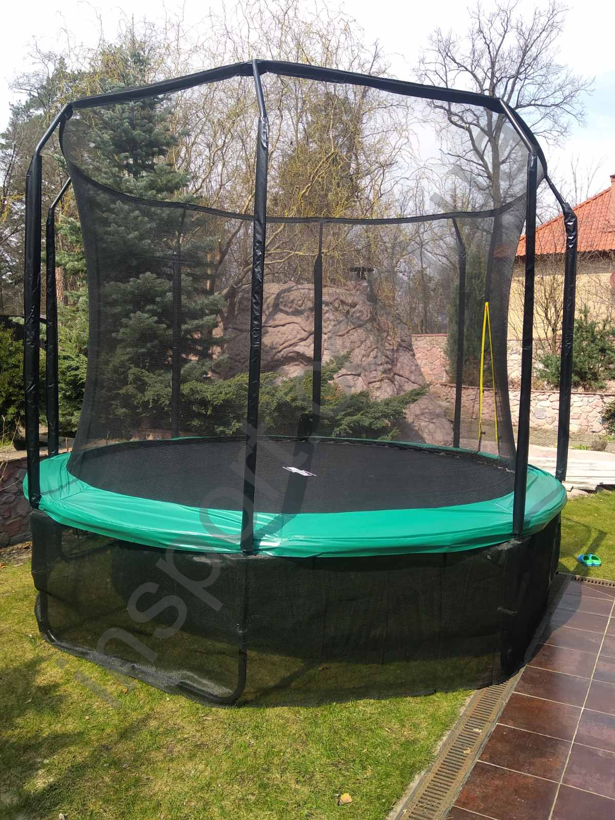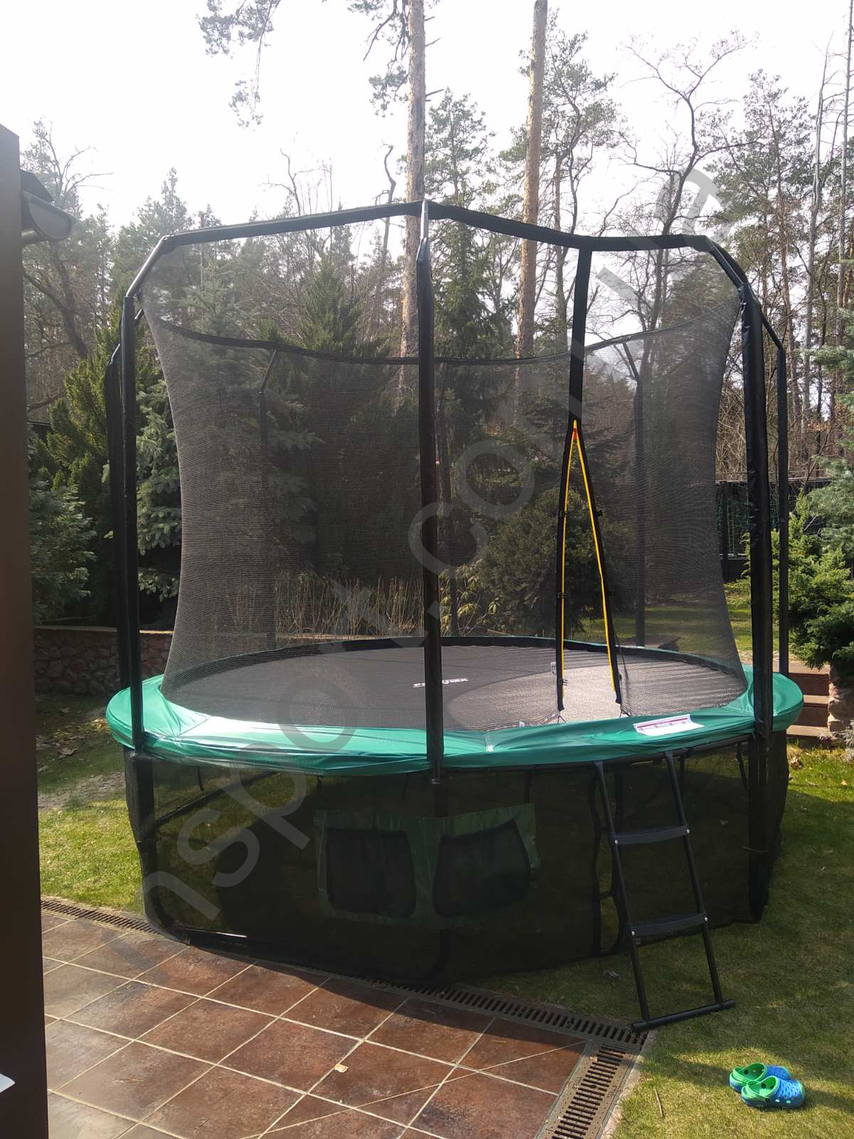 - Полотно и дополнительные элементы выполнены в цвете «Изумрудный газон», батут идеально впишется в экстерьер любого участка