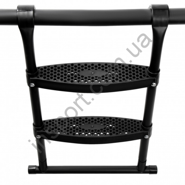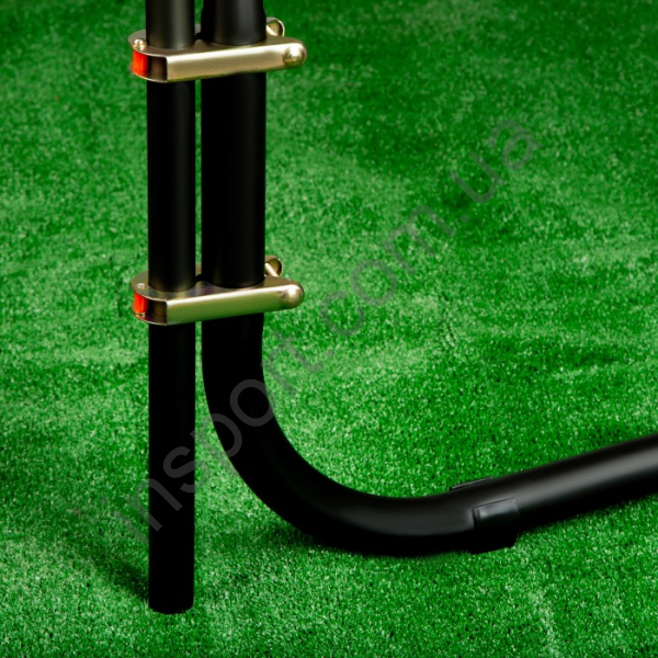 Отличительной особенностью конструкции являются двойные опоры. Патентованный механизм предусматривает двойное крепление металлических хомутов-фиксаторов к W-образным ногам батута. Результаты тестов показали высокие показатели стойкости такой конструкции при многократных критических нагрузках.