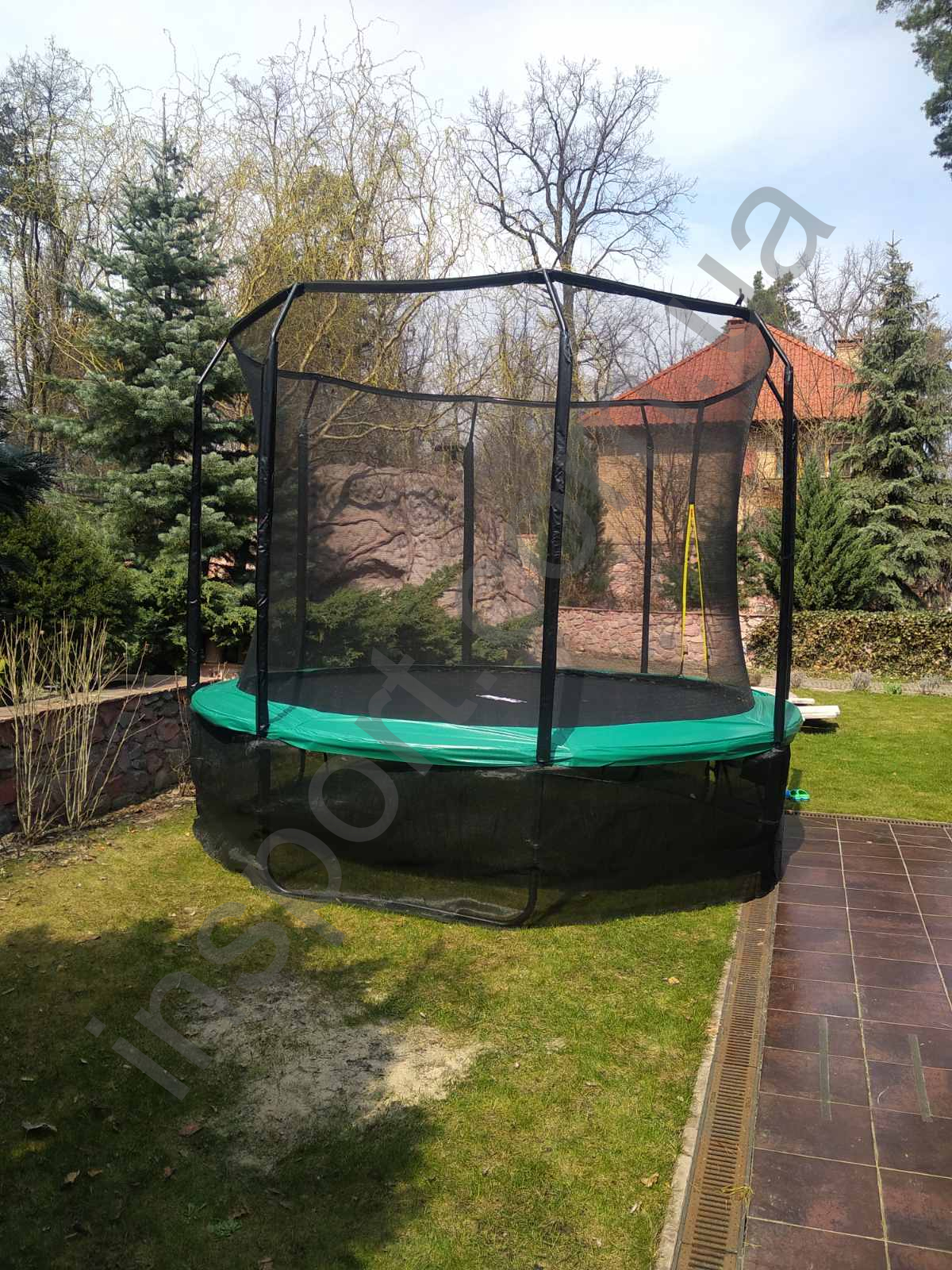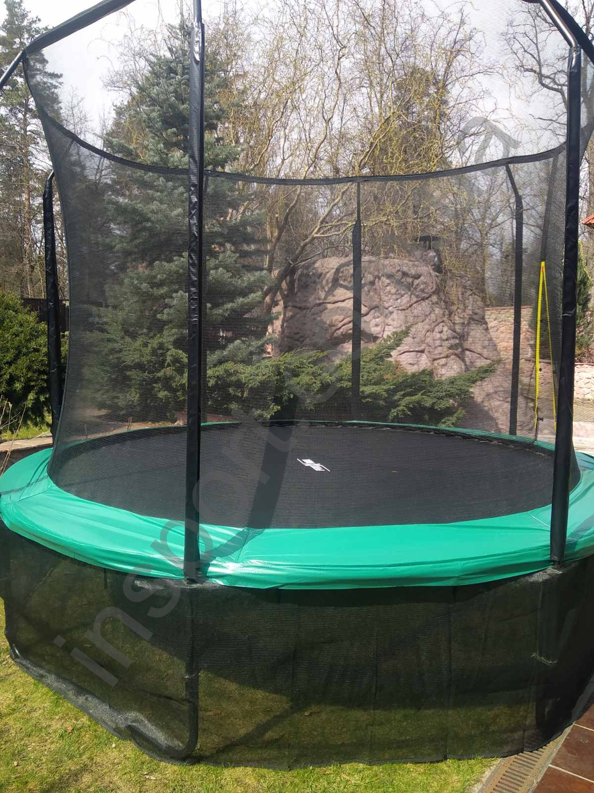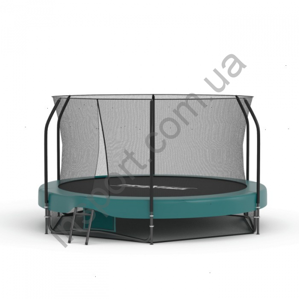 - Полотно и дополнительные элементы выполнены в цвете «Изумрудный газон», батут идеально впишется в экстерьер любого участка