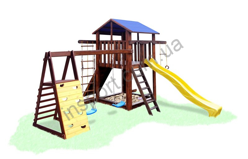 Домик выполнен из натуральной древесины сосны. Он имеет компактные параметры и конструкцию, при которой песочница располагается под домиком, соединяясь лестницей, скалолазкой. На выступающих брусьях монтируются две качели, спортивные кольца и канат. Песочница, имеющая размеры 159х152см, дает возможность малышу весело проводить время в кругу друзей.