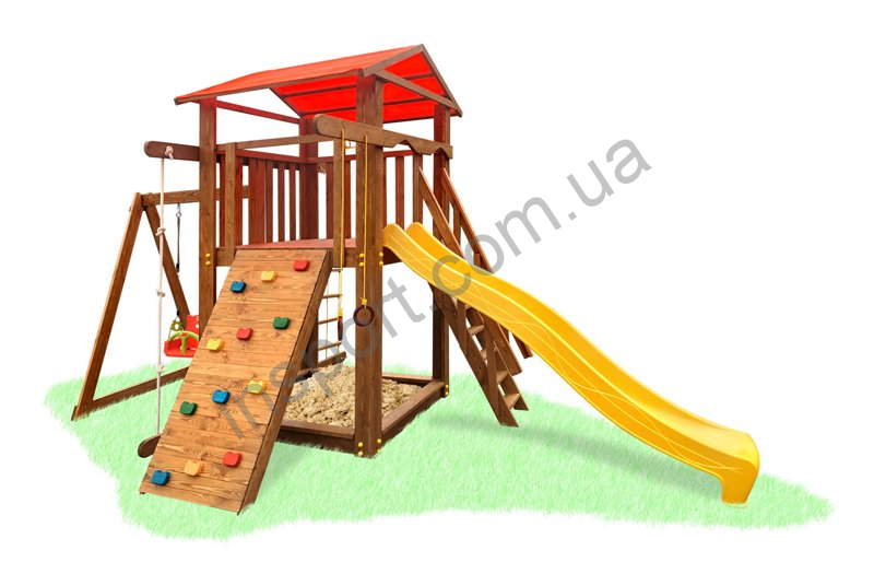 Домик выполнен из натуральной древесины сосны. Он имеет компактные параметры и конструкцию, при которой песочница располагается под домиком, скалолазкой. На выступающих брусьях монтируются две качели, спортивные кольца и канат. Песочница, имеющая размеры 125х125см, дает возможность малышу весело проводить время в кругу друзей.