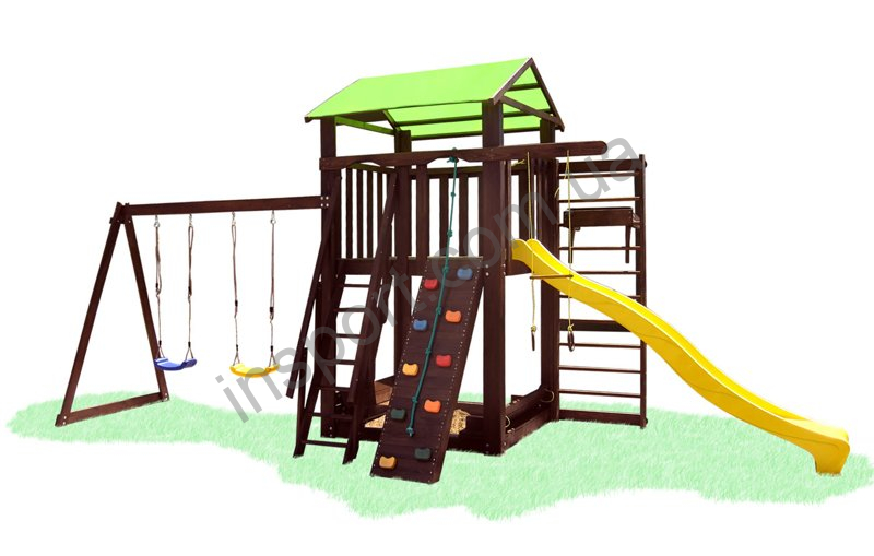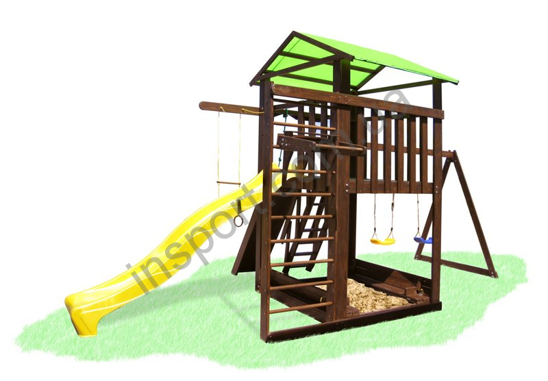Домик выполнен из натуральной древесины сосны. Он имеет компактные параметры и конструкцию, при которой песочница располагается под домиком, скалолазкой. На выступающих брусьях монтируются две качели, спортивные кольца и канат, шведская стенка. Песочница, имеющая размеры 159х152см, дает возможность малышу весело проводить время в кругу друзей.