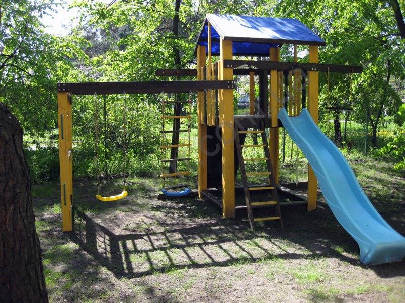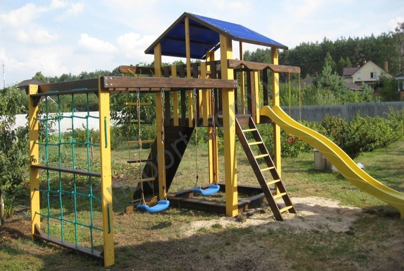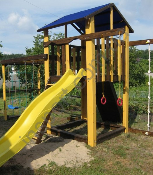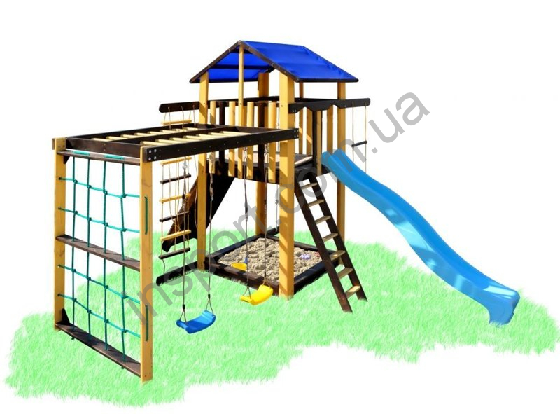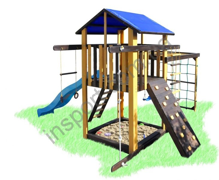Популярный среди спортивной мебели для уличных игровых площадок детский игровой комплекс с рукоходом и качелями Babygrai -3 Пчелка. В комплексе имеется песочница, восхитительный игровой домик, куда ребенок может забраться с помощью скалолазки с пластиковыми насадками, пиратской лесенки, сетки и рукохода.