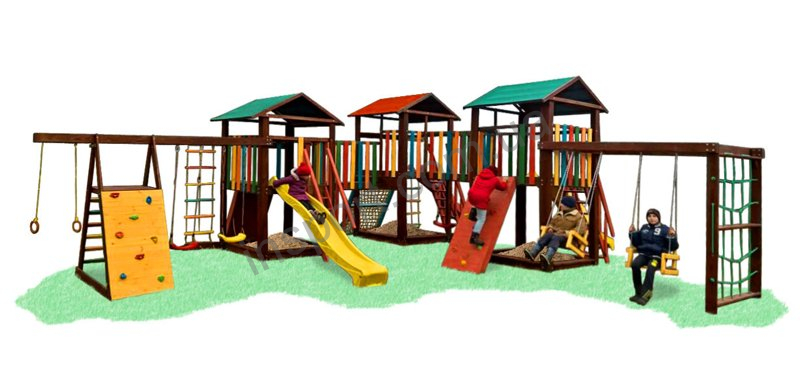 Популярный среди спортивной мебели для уличных игровых площадок детский игровой комплекс с рукоходом и качелями Babygrai -19. В комплексе имеется глубокая песочница, восхитительный игровой домик, куда ребенок может забраться с помощью скалолазки с пластиковыми насадками, пиратской лесенки, сетки и рукохода.