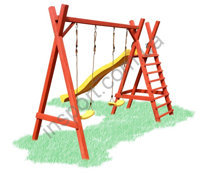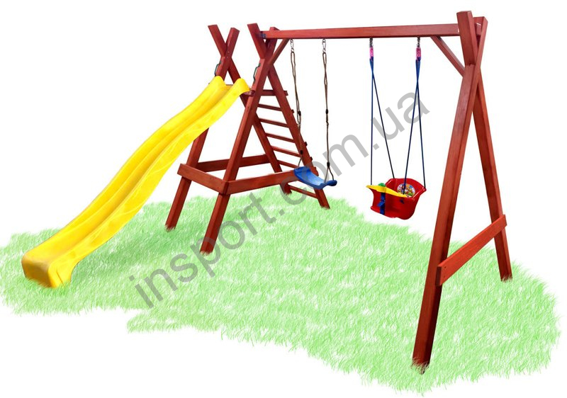 Полулесенка, опорные брусья выполнены из высококачественной сосновой древесины. Качели зафиксированы на высоте 230см. Горка желтого солнечного оттенка изготовлена из прочной пластмассы, имеет закругленные края бортиков.