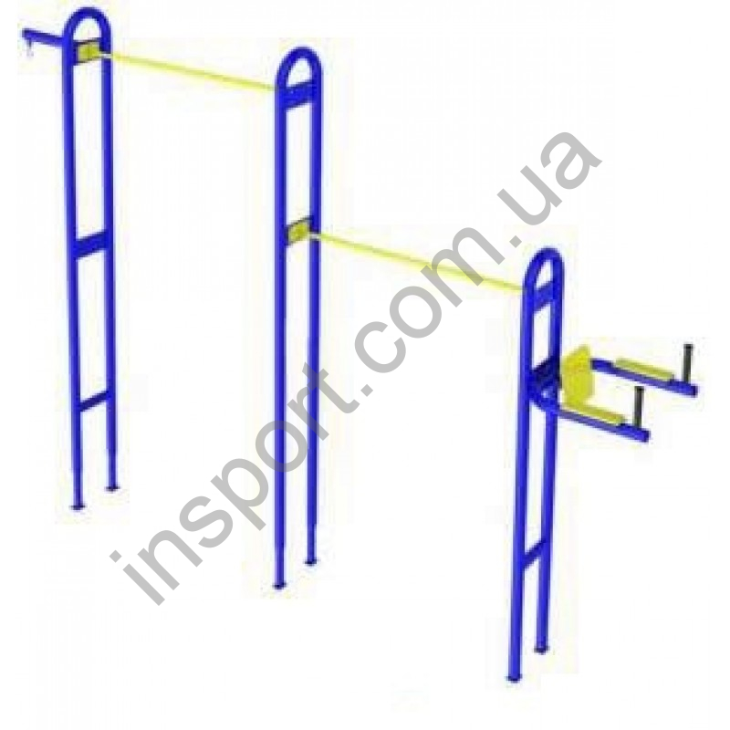 Тренажер являет собой конструкцию с двумя турниками разной высоты, навесом для груши, упором для пресса и брусьями.