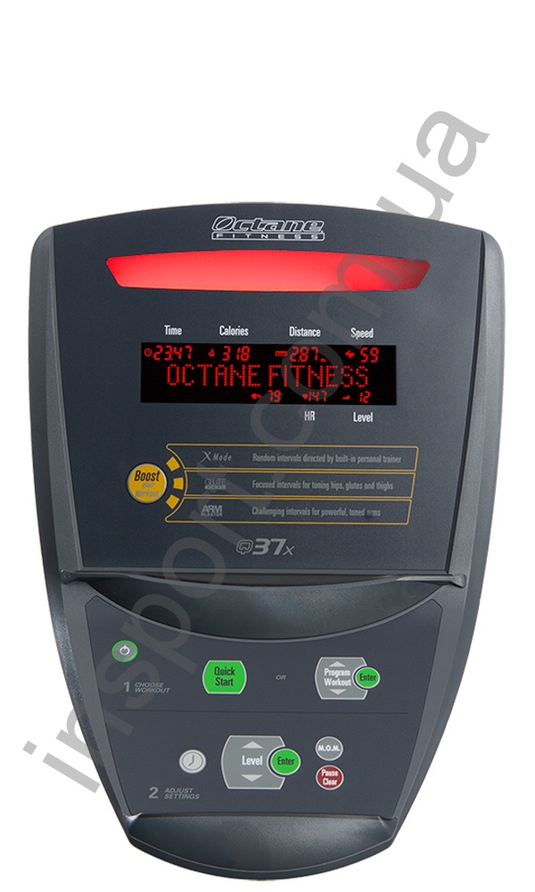 Консоль проста в навигации в независимости от того выбираете вы программу Quick Start или одну из предустановленных программ - или же вы используете подключение Bluetooth для синхронизации с приложением SmartLink. Консоль Q37xi позволяет разместить ваш планшет с тремя вариантами размещения – просмотр, чтение, тренировка. Большой экран одновременно отображает все основные данные тренировки, и только Octane предлагает технологию SmartLight. SmartLight сигнализирует, как интенсивно вы тренируетесь, когда вы находитесь в целевой зоне скорости или частоты сердцебиения, а также при подготовке к следующему интервалу тренировки Workout Booster