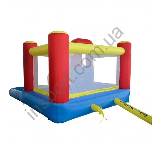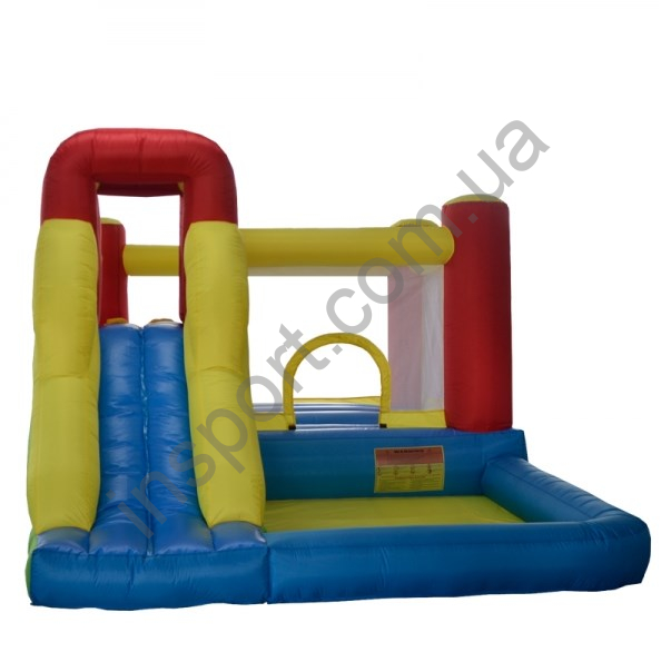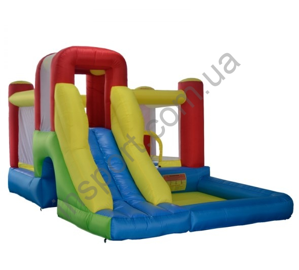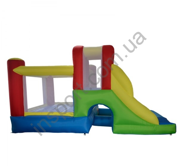 Этот многофункциональный надувной батут имеет 2 закрытых отдела, 1 открытый отдел, высокую горку и мостик под горкой. Батут выполнен в различных, ярких цветах.